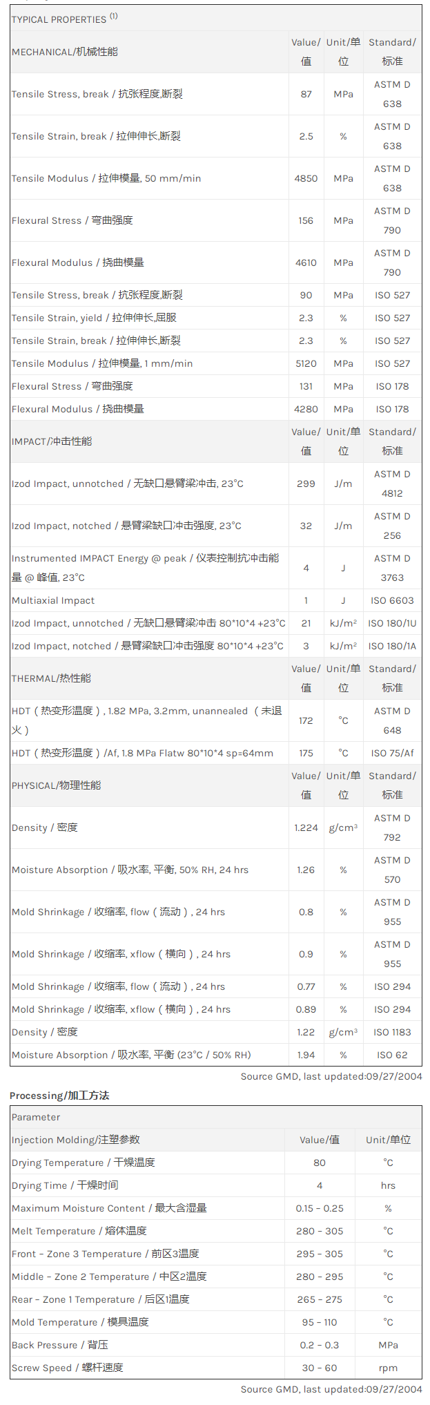 应用范围: 产品描述 LNP Thermocomp RF002ES物性表 “LNP THERMOCOMP RF002ES是一种聚酰胺66(尼龙66)产品,含有的填充物为10%玻璃纤维增强材料,可以通过注射成型进行加工。 特性包括: 加工性能良好 热稳定剂” LNP THERMOCOMP* RF002ES is a compound based on Nylon 66 resin contain