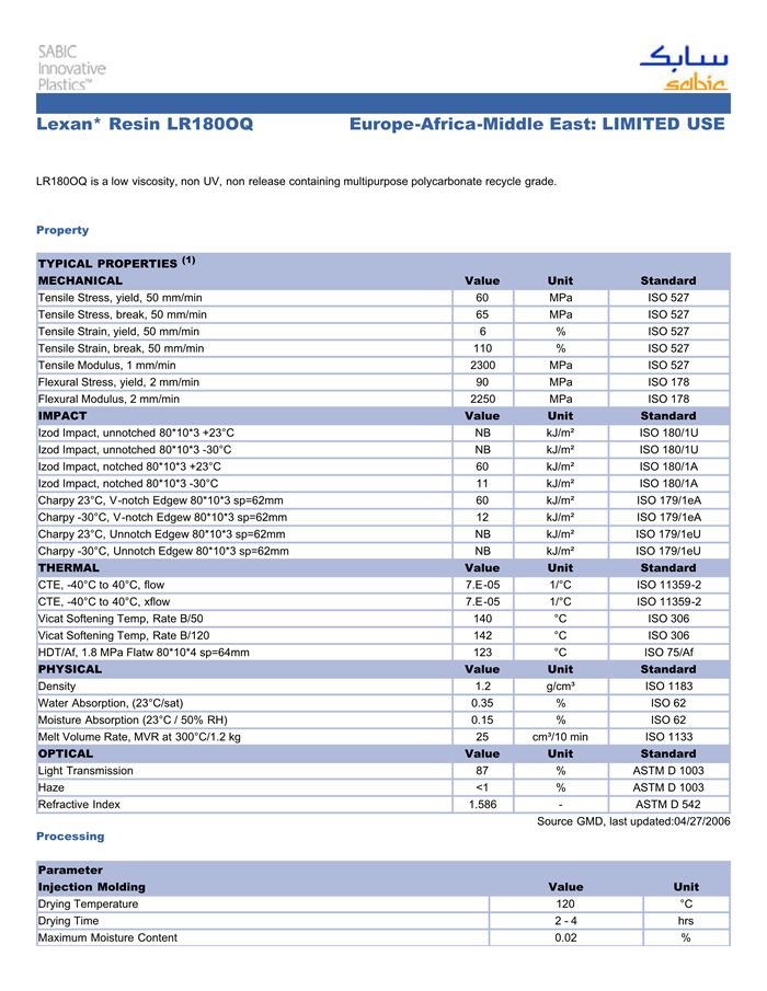 应用范围:产品描述LEXAN PC LR180OQ物性表LR180OQ is a low viscosity, non UV, non release containing multipurpose polycarbonate recycle grade.