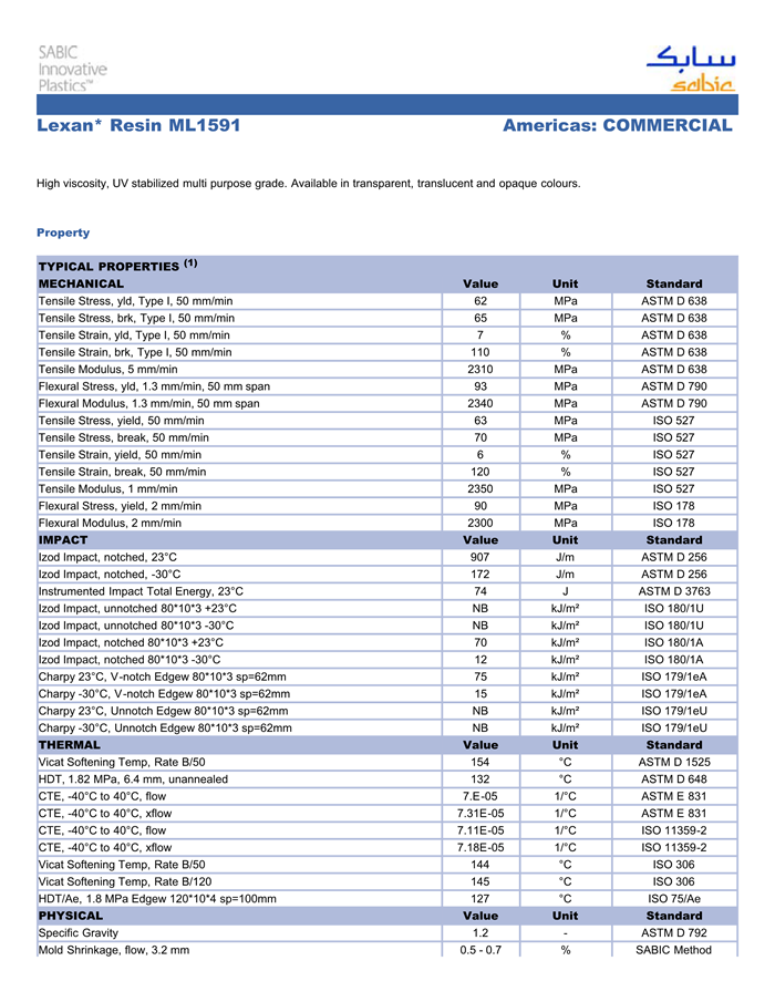 应用范围:产品描述LEXAN PC ML1591物性表High viscosity, UV stabilized multi purpose grade. Available in transparent, translucent and opaque colours.