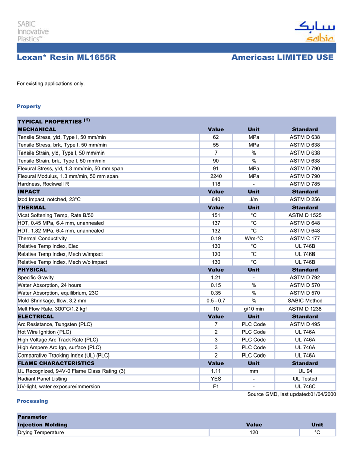 应用范围:产品描述LEXAN PC ML1655R物性表For existing applications only.相关色号:ML1655R-701、ML1655R-WH7B107