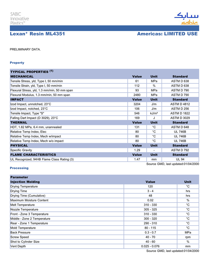 应用范围:产品描述LEXAN PC ML4351物性表PRELIMINARY DATA.相关色号:ML4351-80118、ML4351-WH9A054
