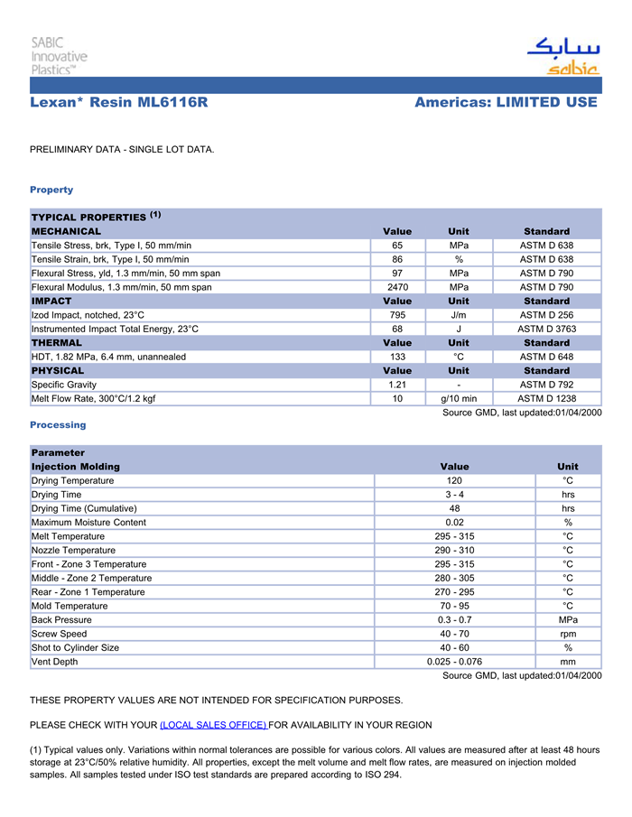 应用范围:产品描述LEXAN PC ML6116R物性表PRELIMINARY DATA – SINGLE LOT DATA.