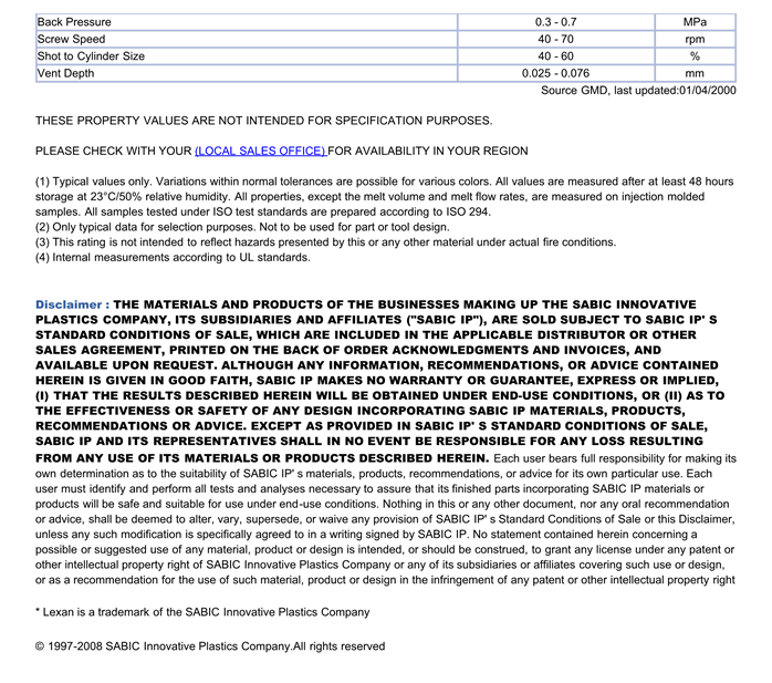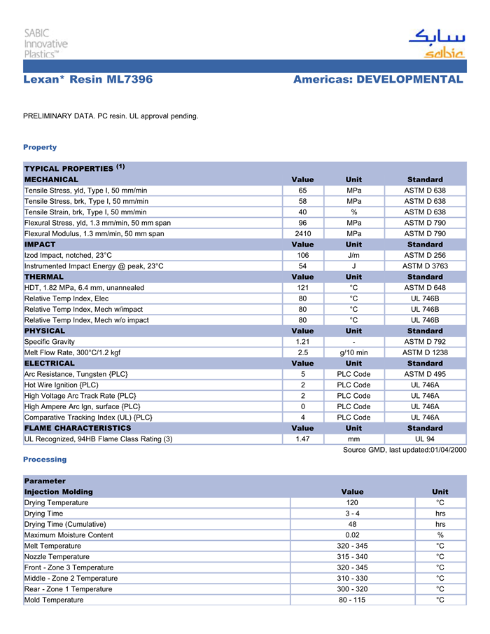 应用范围:产品描述LEXAN PC ML7396物性表PRELIMINARY DATA. PC resin. UL approval pending.