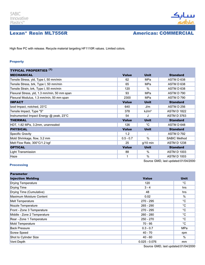 应用范围:产品描述LEXAN PC ML7556R物性表High flow PC with release. Recycle material targeting HF1110R values. Limited colors.