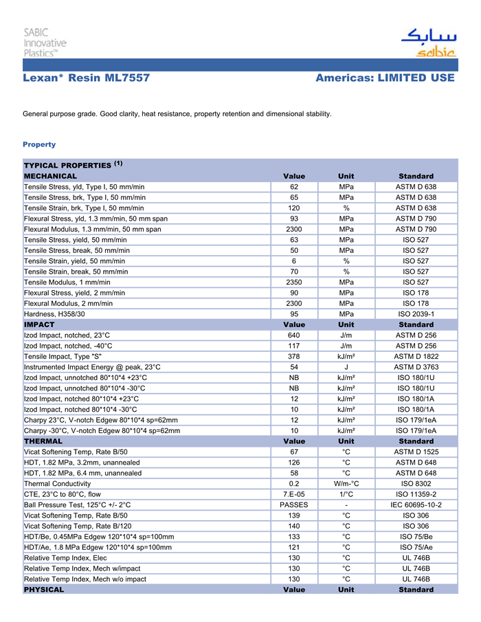 应用范围:产品描述LEXAN PC ML7557物性表General purpose grade. Good clarity, heat resistance, property retention and dimensional stability.
