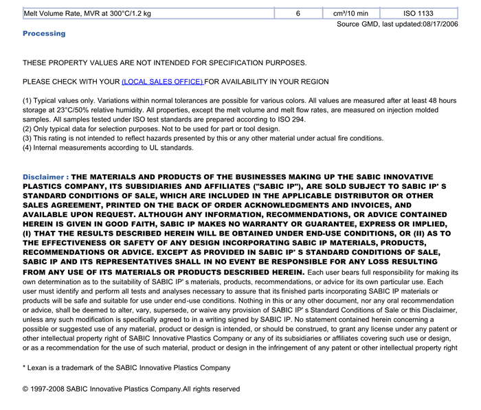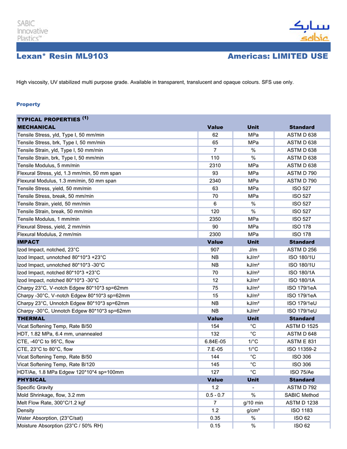 应用范围:产品描述LEXAN PC ML9103物性表High viscosity, UV stabilized multi purpose grade. Available in transparent, translucent and opaque colours. SFS use only.