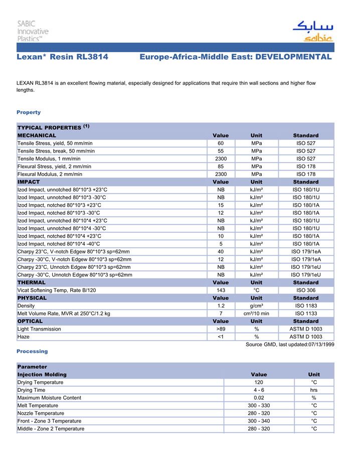 LEXAN RL3814 is an excellent flowing material, especially designed for applications that require thin wall sections and higher flow lengths.