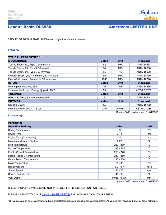应用范围:产品描述LEXAN PC RL6538物性表SINGLE LOT DATA (L37048, 70656 color): High flow, superior release.