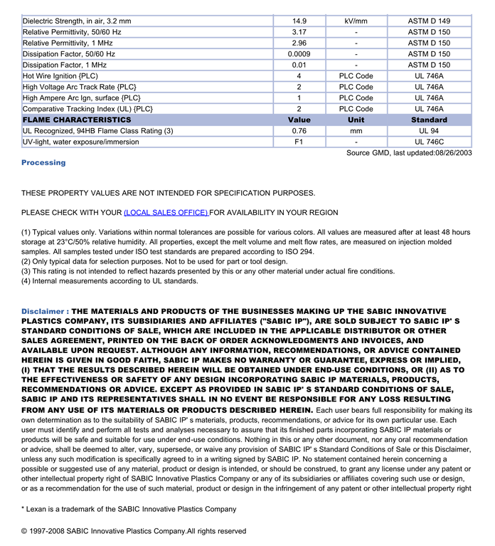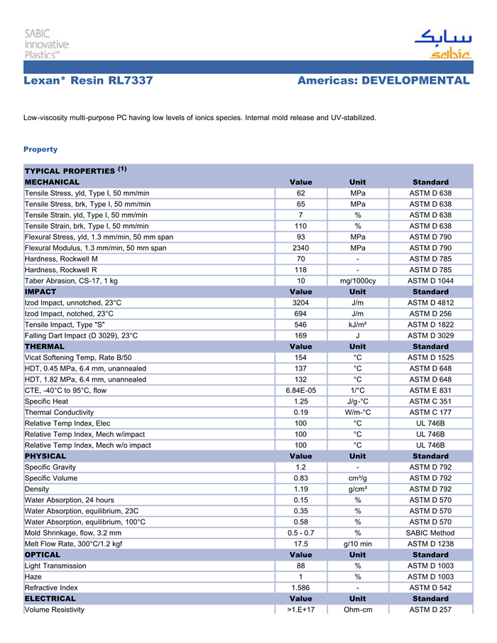 应用范围:产品描述LEXAN PC RL7337物性表Low-viscosity multi-purpose PC having low levels of ionics species. Internal mold release and UV-stabilized.