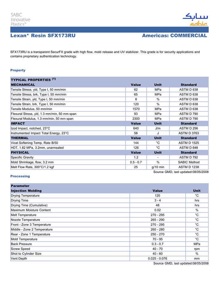 Lexan SFX173RU resin是一种聚碳酸酯(PC)产品,它可以通过注射成型进行加工,在北美洲有供货。