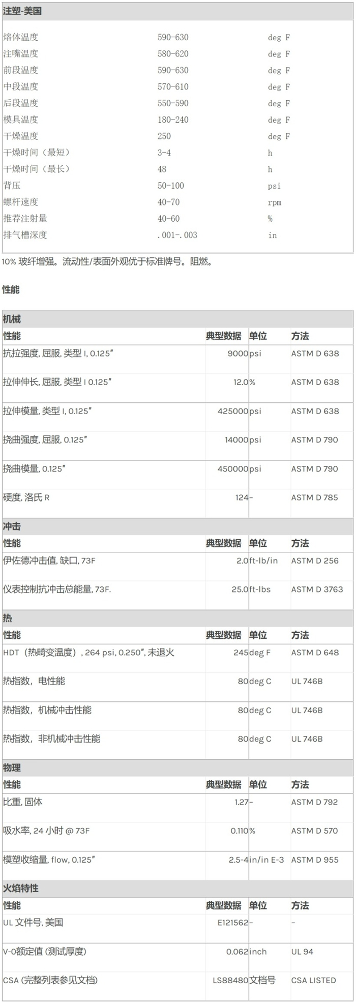 应用范围: 产品描述 Lexan PC SP1352物性表 10% 玻纤增强。流动性/表面外观优于标准牌号。阻燃。 加工