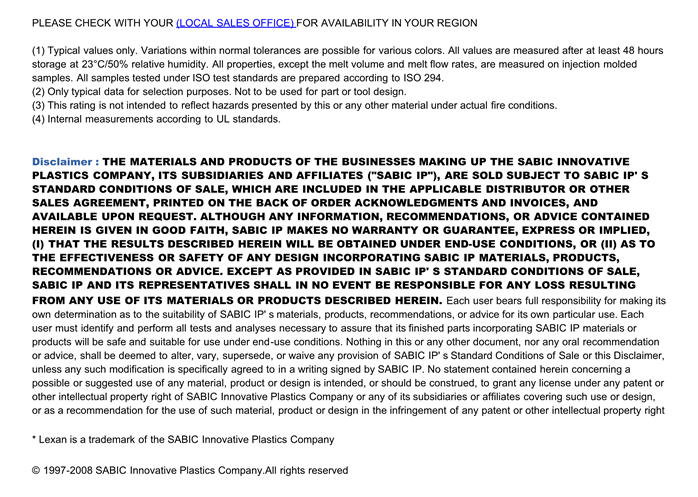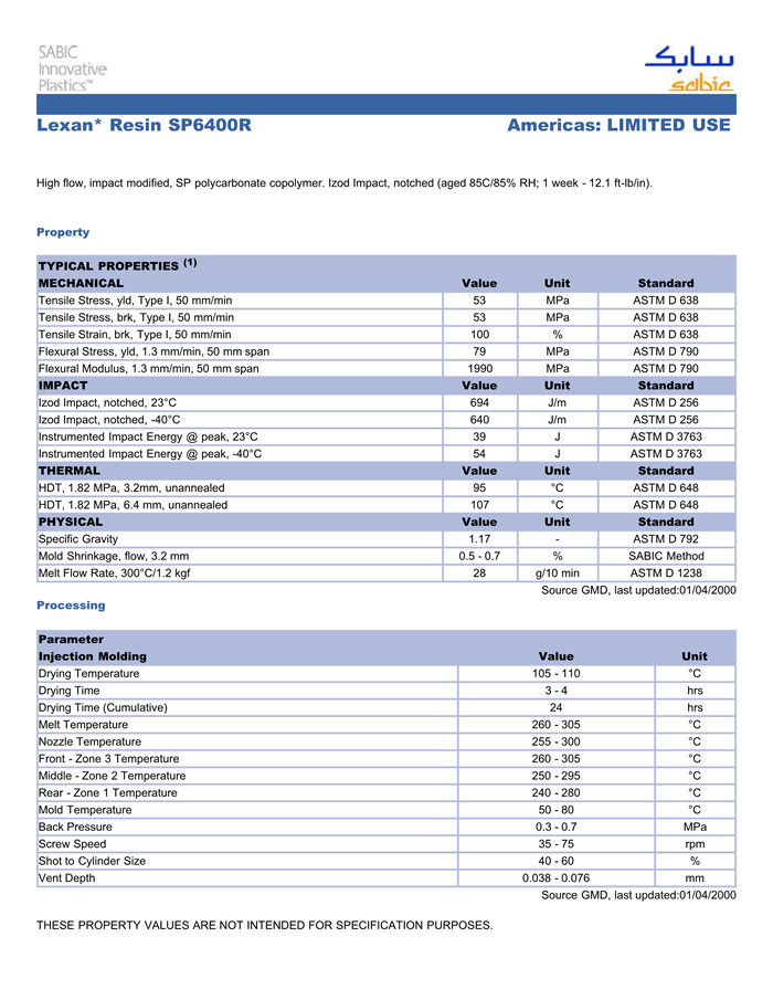 应用范围:产品描述LEXAN PC SP6400R物性表高流动性、抗冲击性改良的SP聚碳酸酯共聚物。伊佐德冲击值,缺口 (aged 85C/85% RH; 1 周 – 12.1 ft-lb/in).