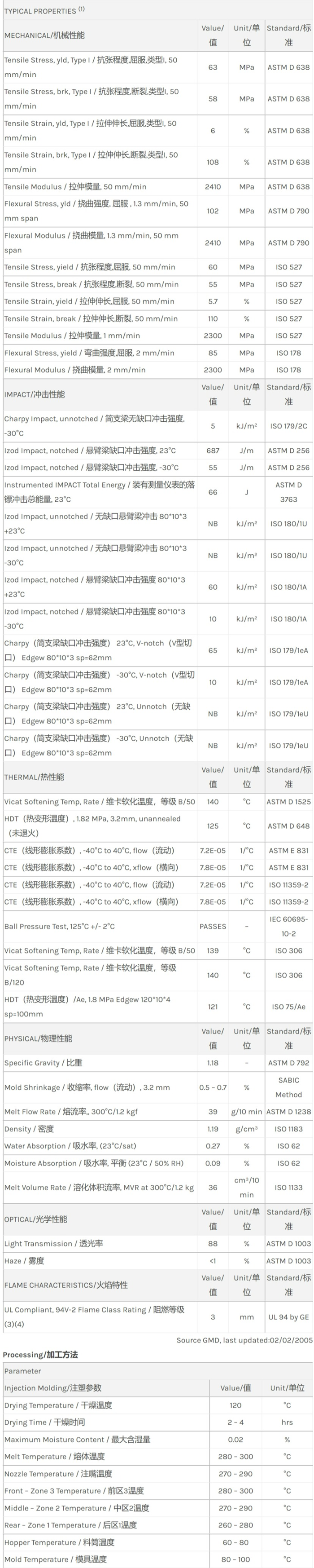 应用范围:产品描述Lexan PC HP1HF物性表“Lexan HP1HF resin是一种聚碳酸酯(PC)产品,它可以通过注射成型进行加工。典型应用领域为:医疗/保健。特性包括:阻燃/额定火焰高流动性具可灭菌性生物相容”。相关颜色色号:HP1HF-111Very high flow, biocompatible polycarbonate for healthcare applications. EtO