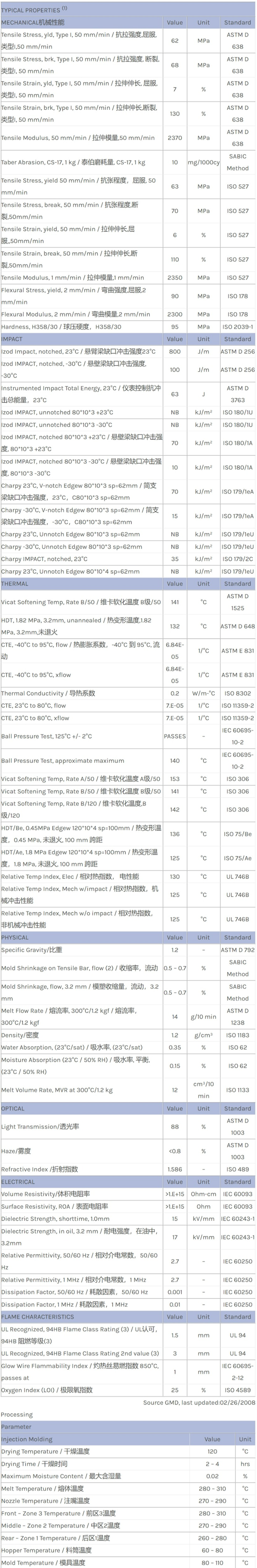 应用范围:产品描述LEXAN PC HP3AEU物性表Medium flow polycarbonate. For medical devices and pharmaceutical applications. Healthcare management of change, biocompatible (ISO10993 or USP Class VI). EtO and steam steriliza