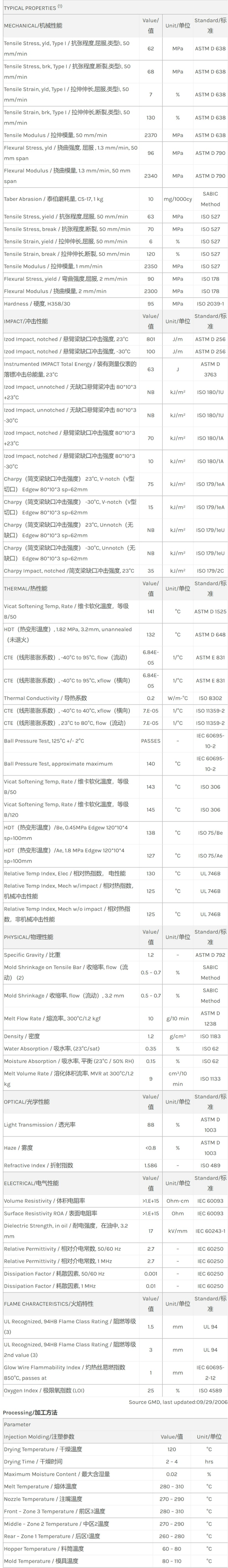 应用范围:产品描述Lexan PC HP4REU物性表“Lexan HP4REU resin是一种聚碳酸酯(PC)材料,加工方式为:注射成型。典型应用领域为:医疗/保健主要特性有:阻燃/额定火焰通过 ROHS 认证具可灭菌性生物相容脱模剂”Medium flow polycarbonate. For medical devices and pharmaceutical applications. Healt