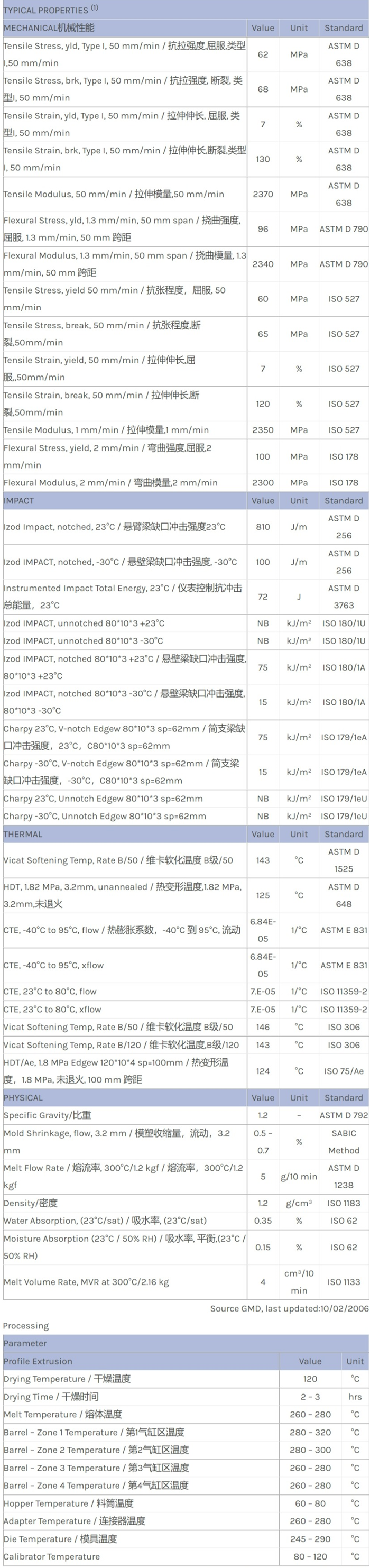 应用范围:产品描述LEXAN PC HP9NREU物性表Very high viscosity, branched polycarbonate. For medical devices and pharmaceutical applications. Healthcare management of change, biocompatible (ISO10993 or USP Class VI). EtO