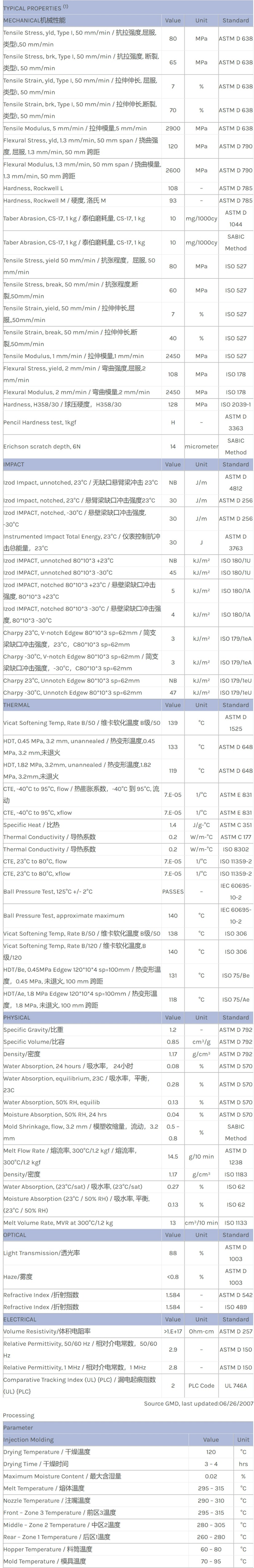 应用范围:产品描述LEXAN PC HPB3144物性表Standard flow, transparent, high purity polycarbonate copolymer resin with reduced oxygen permeability and water vapor transmission rate. For medical devices and pharmaceutical