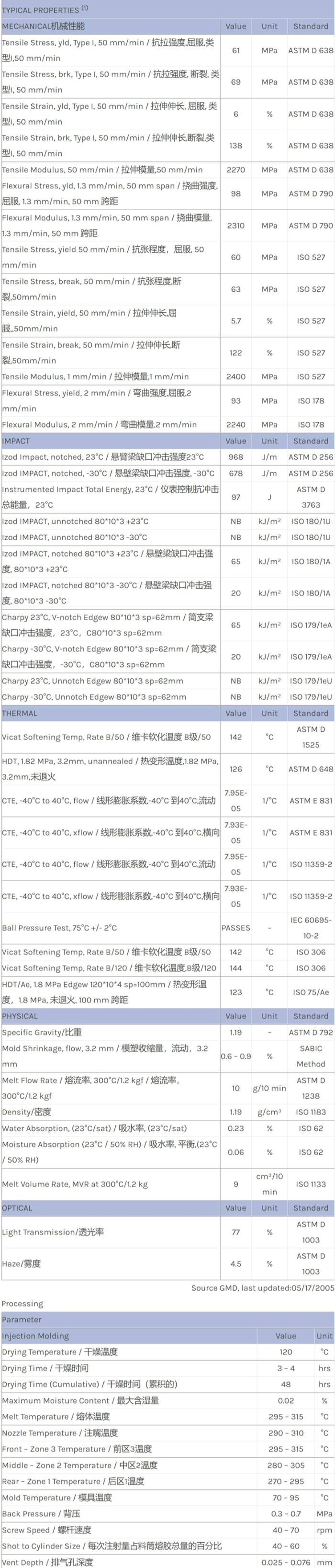 应用范围:产品描述LEXAN PC HPM1944物性表Medium flow specialty polycarbonate with enhanced hemocompatability. For medical devices and pharmaceutical applications. Healthcare management of change, biocompatible (ISO1099