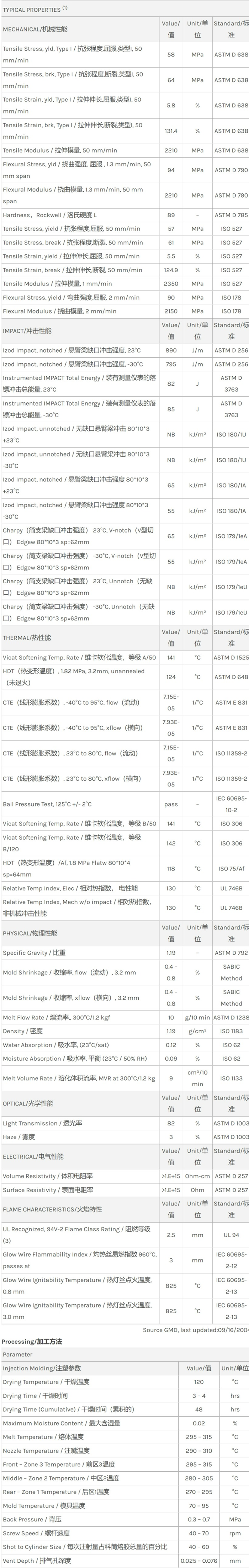 应用范围:产品描述Lexan PC HPX4物性表“Lexan HPX4 resin是一种聚碳酸酯(PC)产品,它可以通过注射成型进行加工。典型应用领域为:医疗/保健。特性包括:阻燃/额定火焰具可灭菌性加工性能良好生物相容”。相关颜色色号:HPX4-1H8A005T、HPX4-4H5D066T、HPX4-7H9D013Medium flow specialty polycarbonate – improve