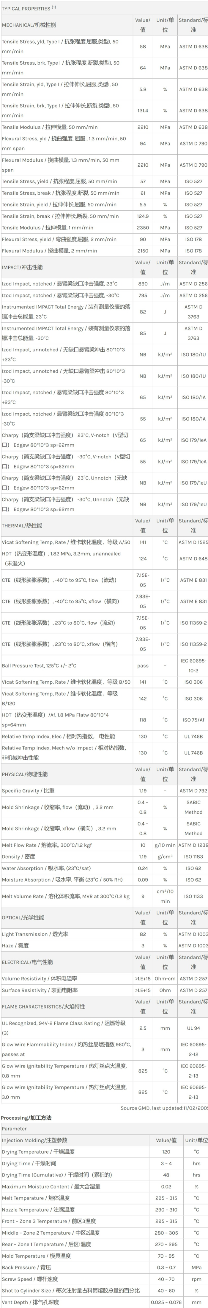 应用范围:产品描述Lexan PC HPX4R物性表“Lexan HPX4R resin是一种聚碳酸酯(PC)产品,它可以通过注射成型进行加工。典型应用领域为:医疗/保健。特性包括:阻燃/额定火焰具可灭菌性加工性能良好柔软生物相容”Medium flow specialty polycarbonate with outstanding processability, ductility and autocl