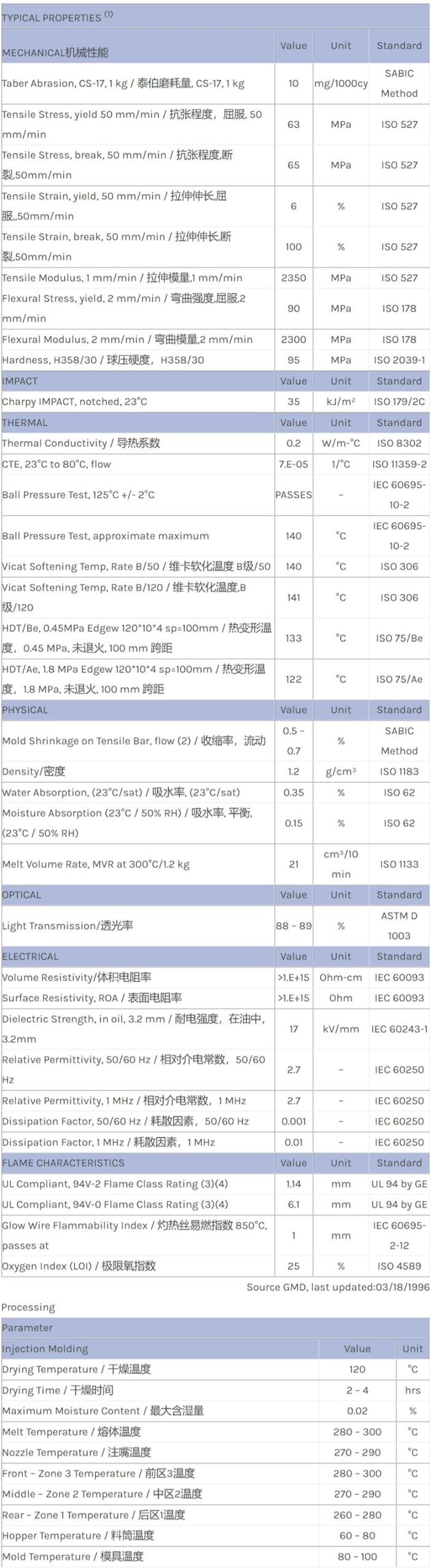 应用范围:产品描述LEXAN PC ML3837物性表LEXAN ML3837 is a low viscosity multi purpose grade, suitable for steam sterilization applications and it is compliant with food contact and medical regulations.