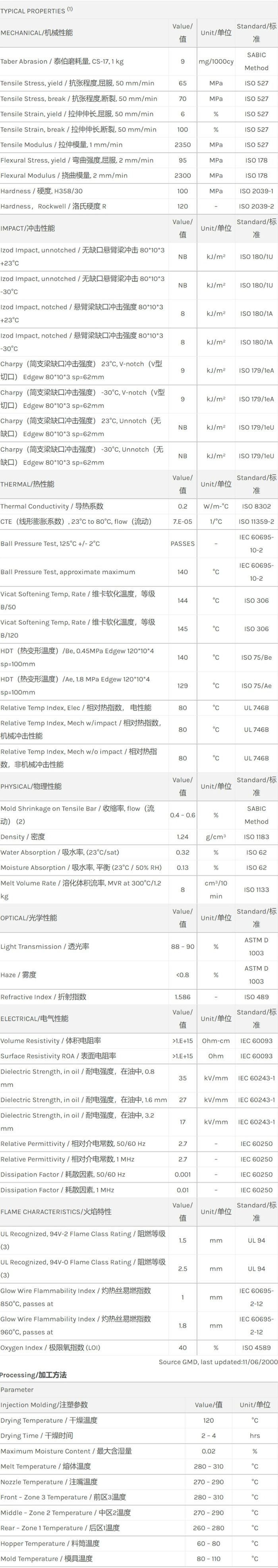 应用范围:产品描述Lexan PC 2034物性表“Lexan 2034 resin是一种聚碳酸酯(PC)材料,加工方式为:注射成型。主要特性有:阻燃/额定火焰通过 ROHS 认证Flame Retardant中等粘度紫外线稳定”。相关颜色色号:2034-116LEXAN 2034 is a medium viscosity flame retardant grade. The material is UV