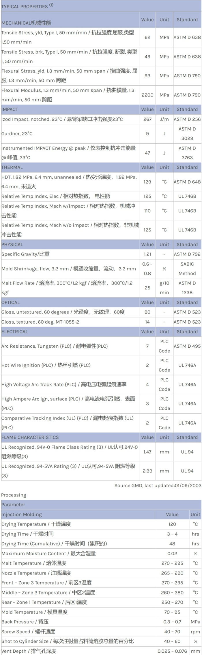 应用范围:产品描述LEXAN PC BE2130物性表FOR EXISTING APPLICATIONS ONLY. High flow, excellent flame rating, standard gloss. Durable, good cost-to- performance balance. Excellent for computer cabinetry and enclosures.