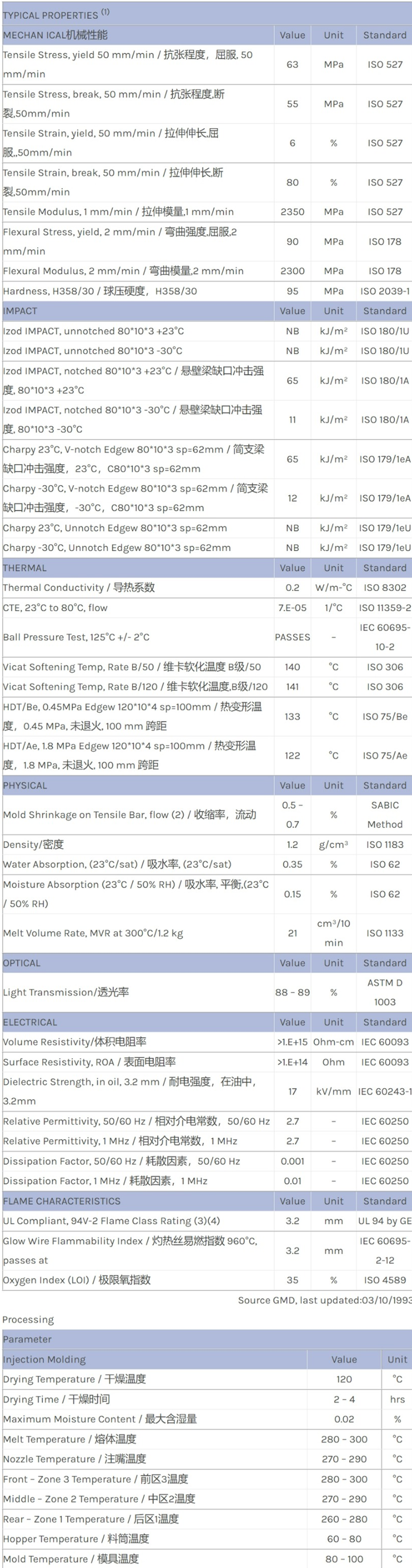 应用范围:产品描述LEXAN PC ML3438物性表LEXAN ML3438 is a low viscosity, flame retardant grade with an improved release performance to ensure easy processing.
