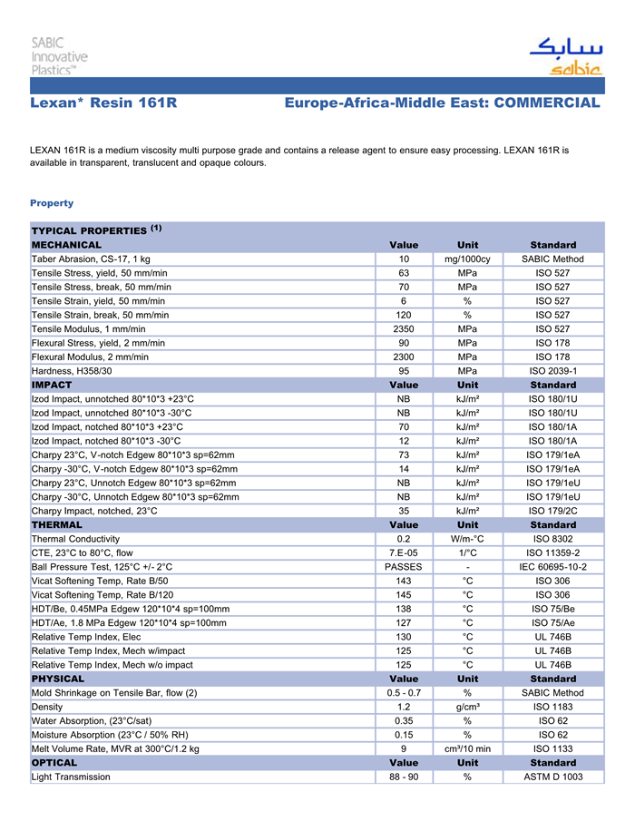 LEXAN 161R is a medium viscosity multi purpose grade and contains a release agent to ensure easy processing. LEXAN 161R is available in transparent, translucent and opaque colours.