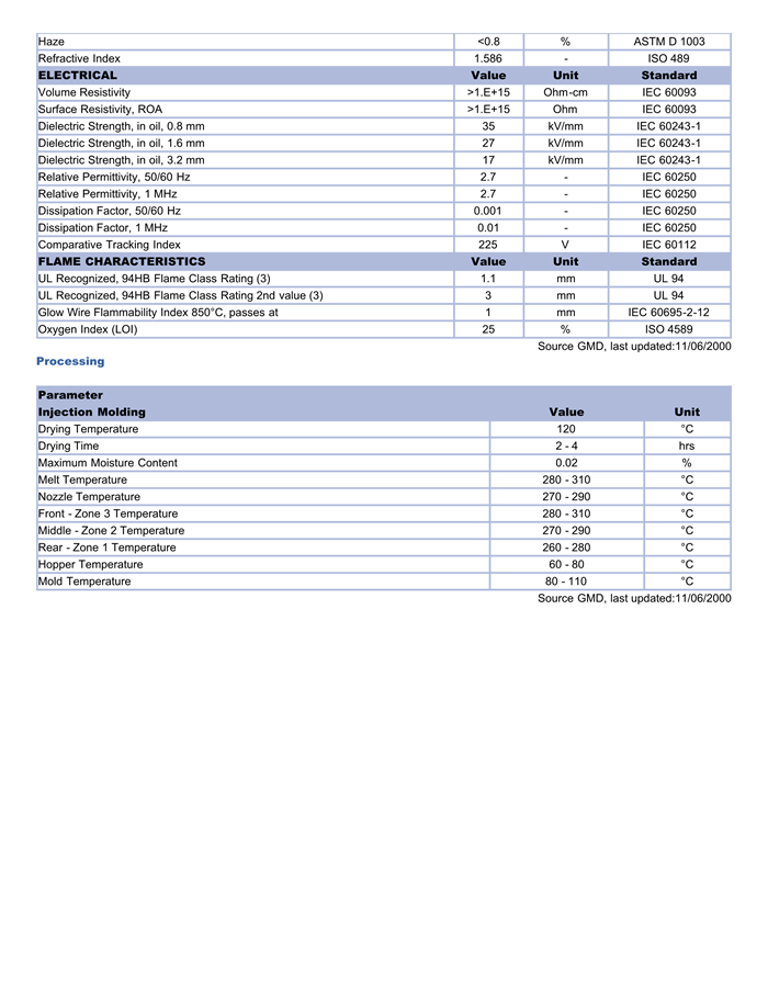 应用范围:产品描述Lexan PC 161R物性表“Lexan 161R resin是一种聚碳酸酯(PC)材料,加工方式为:注射成型。主要特性有:阻燃/额定火焰通过 ROHS 认证加工性能良好脱模剂中等粘度Lexan 161R resin的典型应用领域为:汽车行业”。相关颜色色号:161R-111J、161R-111、161R-71257、161R-411、161R-RD4E080LEXAN 161R is