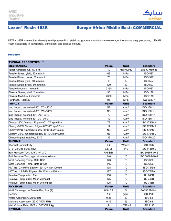 LEXAN 163R is a medium viscosity multi purpose U.V. stabilized grade and contains a release agent to ensure easy processing. LEXAN 163R is available in transparent, translucent and opaque colours.