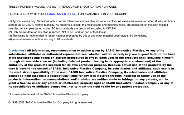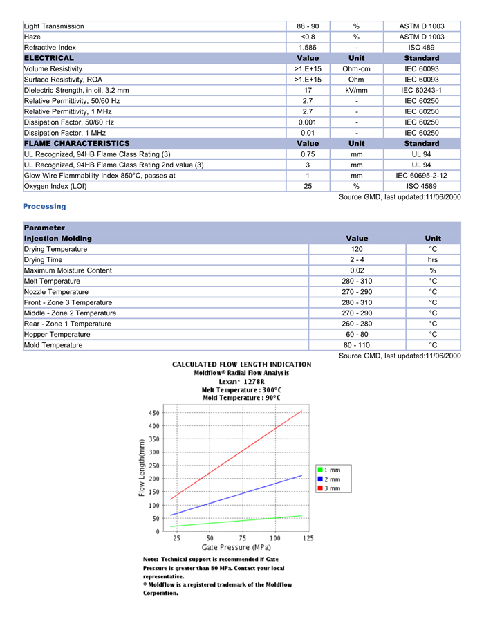 应用范围:产品描述Lexan PC 163R物性表“Lexan 163R resin是一种聚碳酸酯(PC)材料,加工方式为:注射成型。主要特性有:阻燃/额定火焰通过 ROHS 认证加工性能良好脱模剂中等粘度”。相关颜色色号:163R-GY5A716、163R-111LEXAN 163R is a medium viscosity multi purpose U.V. stabilized grade and