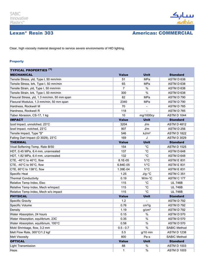 应用范围:产品描述LEXAN PC 303物性表透明、高黏度材料。满足HID照明的恶劣环境要求。相关色号:303-111