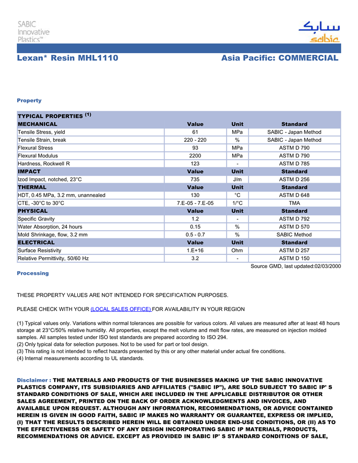 Lexan MHL1110 resin是一种聚碳酸酯(PC)材料,该产品在亚太地区有供货。