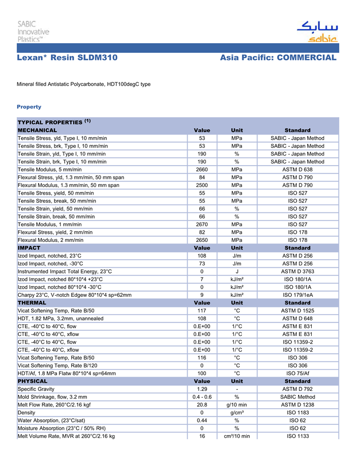 应用范围:产品描述LEXAN PC SLDM310物性表Lexan SLDM310 resin是一种聚碳酸酯(PC)材料,含有的填充物为矿物填料。加工方式为:注射成型。主要特性为:抗静电
