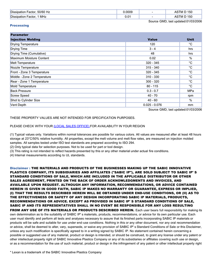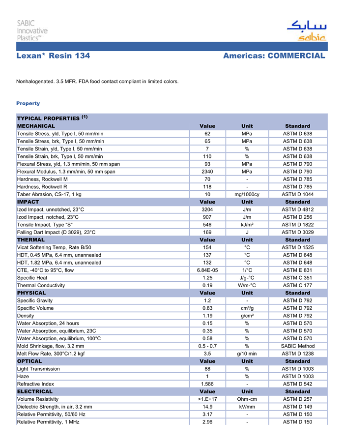 应用范围:产品描述LEXAN PC 134物性表非卤化物。熔体流动速率MFR:3.5。符合FDA 规范 (有颜色限制)。