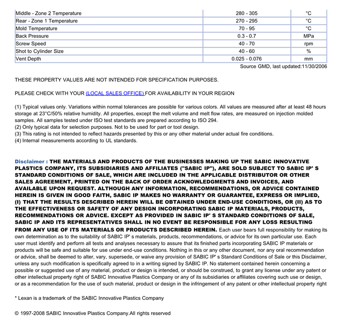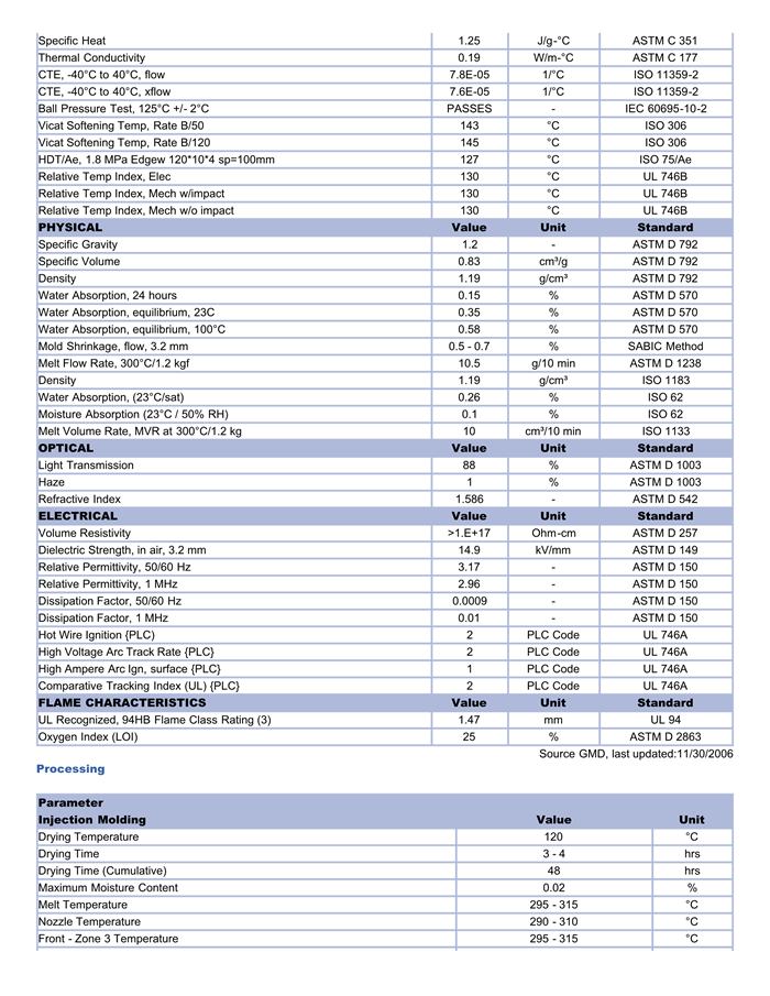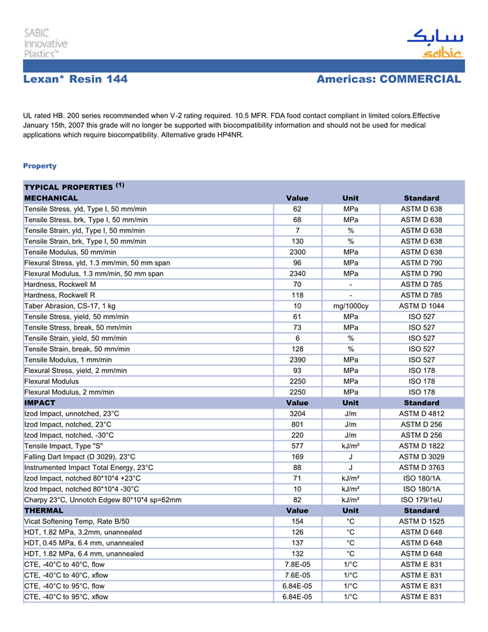 应用范围:产品描述LEXAN PC 144物性表非卤化物。熔体流动速率MFR:10.5。符合 FDA 规范(有颜色限制)