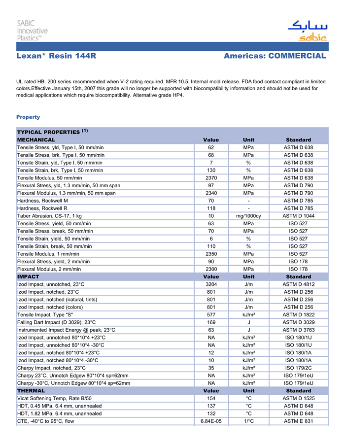 Lexan PC 144R物性表