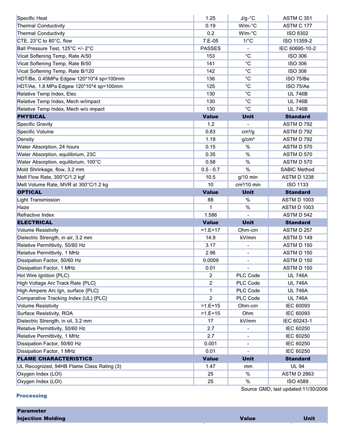 UL rated HB. 200 series recommended when V-2 rating required. MFR 10.5. Internal mold release. FDA food contact compliant in limited colors.Effective January 15th, 2007 this grade will no longer be supported with biocompatibility information and should not be used for medical applications which require biocompatibility. Alternative grade HP4.