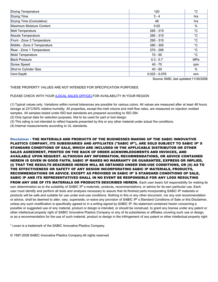 应用范围:产品描述Lexan PC 144R物性表熔体流动速率MFR:10.5。 按FDA规范制造(21 CFR 177.1580)的食物接触用具,内含脱模剂相关颜色色号:144R-111FC、144R-112FC、144R-GY5G128QUL rated HB. 200 series recommended when V-2 rating required. MFR 10.5. Internal mol