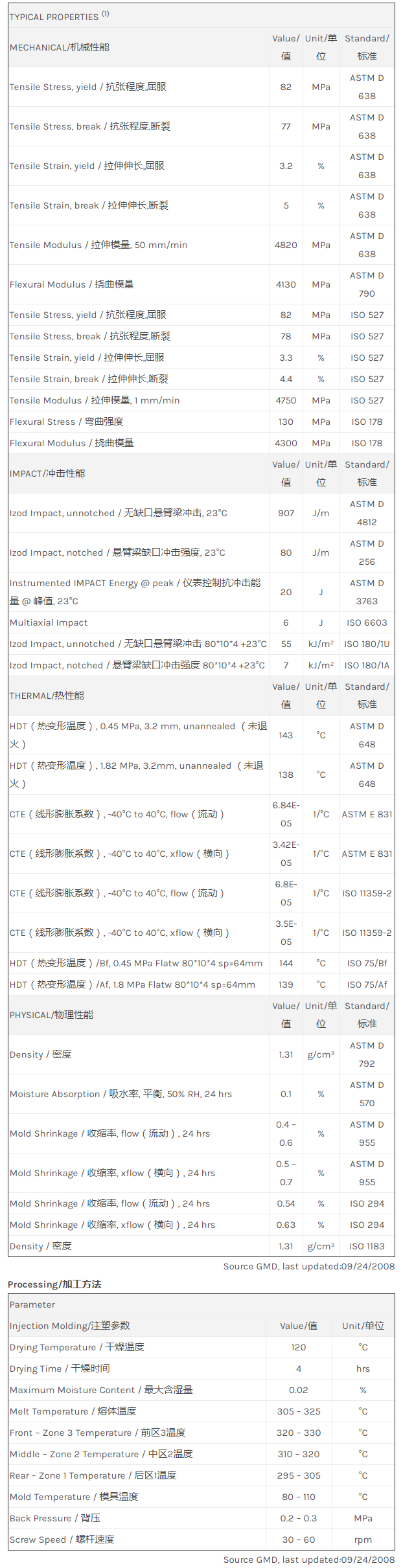 应用范围: 产品描述 LNP Thermocomp DF003E物性表 “LNP THERMOCOMP DF003E是一种聚碳酸酯(PC)产品,含有的填充物为15%玻璃纤维增强材料,可以通过注射成型进行加工。 主要特性为:加工性能良好。” LNP* Thermocomp* DF003E is a compound based on Polycarbonate resin containing Gl