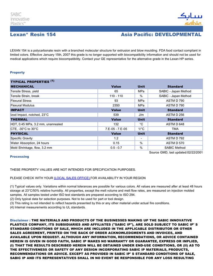 LEXAN 154 is a polycarbonate resin with a branched molecular structure for extrusion and blow moulding. FDA food contact compliant in limited colors. Effective January 15th, 2007 this grade is no longer supported with biocompatibility information and should not be used for medical applications which require biocompatibility. Contact your GE representative for the alternative grade in the Lexan HP series.
