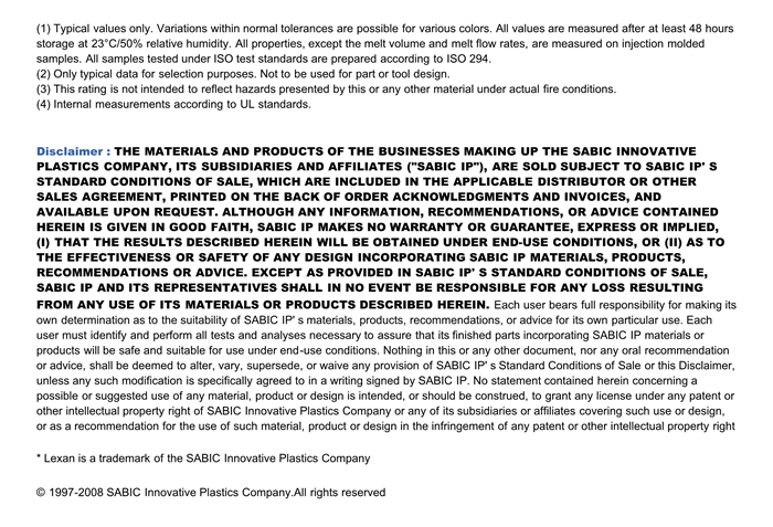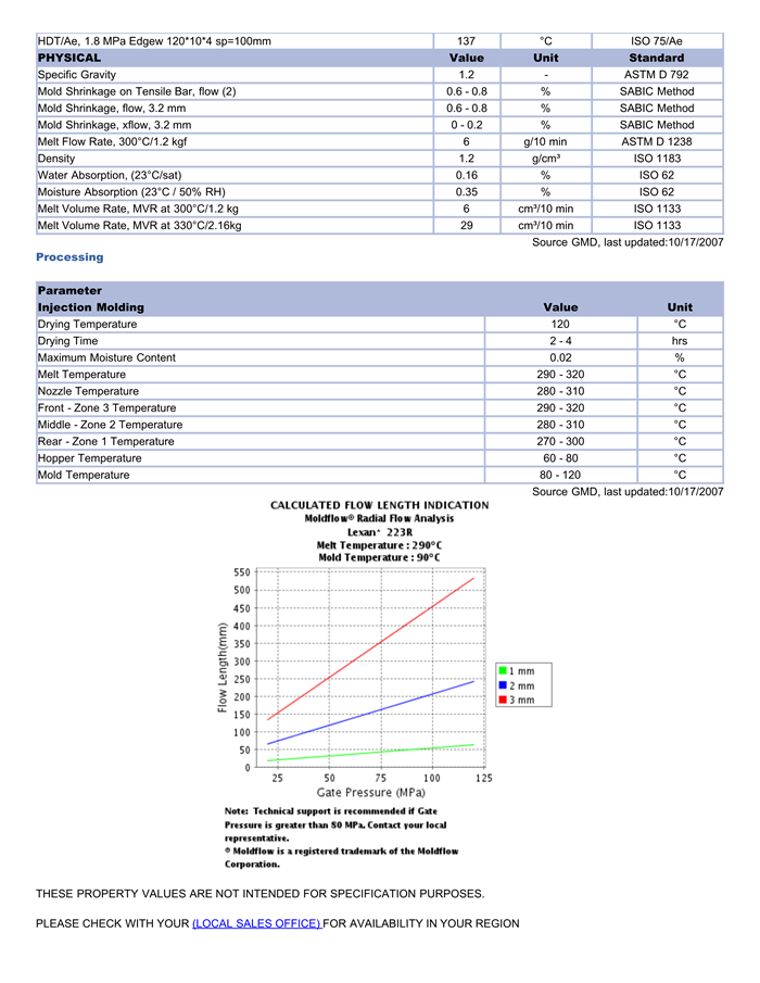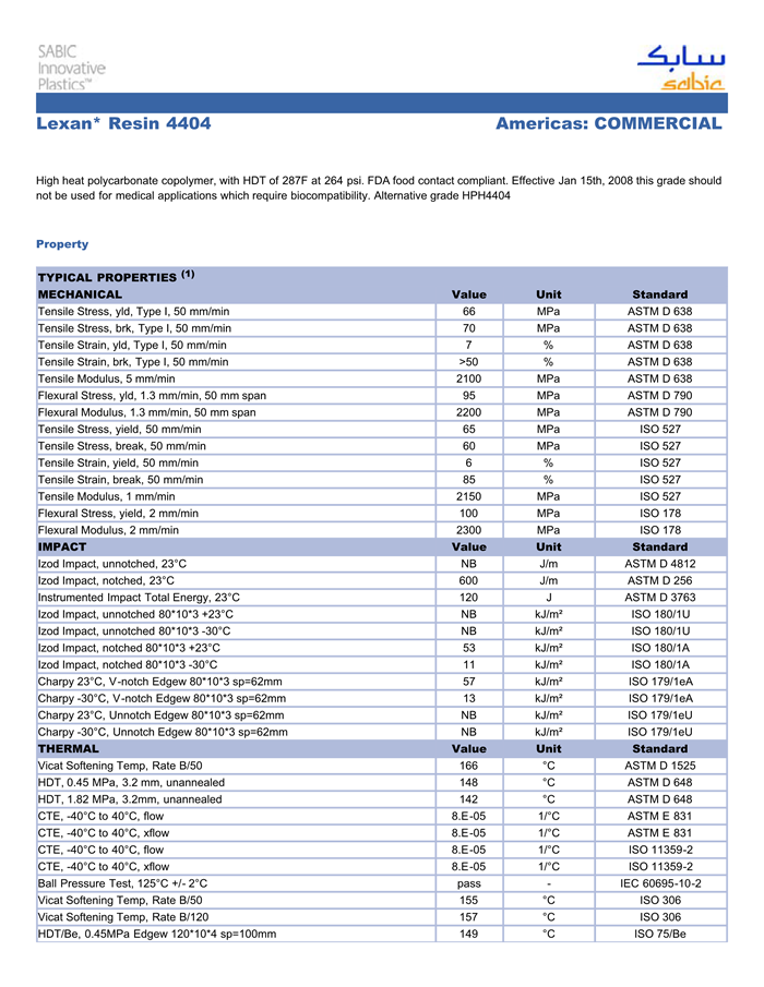 应用范围:产品描述LEXAN PC 4404物性表High heat polycarbonate copolymer, with HDT of 287F at 264 psi. FDA food contact compliant. Effective Jan 15th, 2008 this grade should not be used for medical applications which re