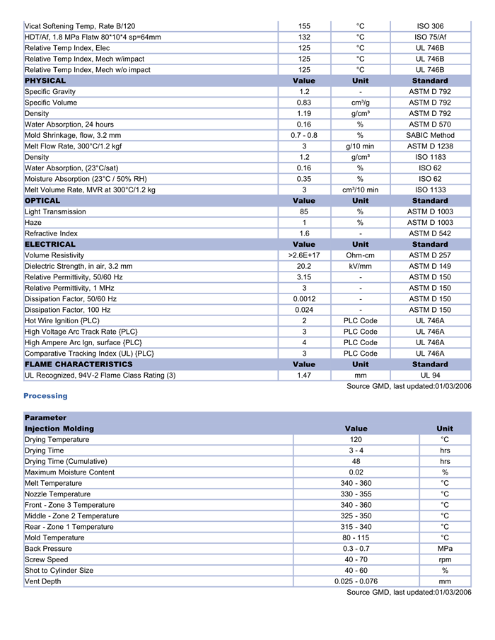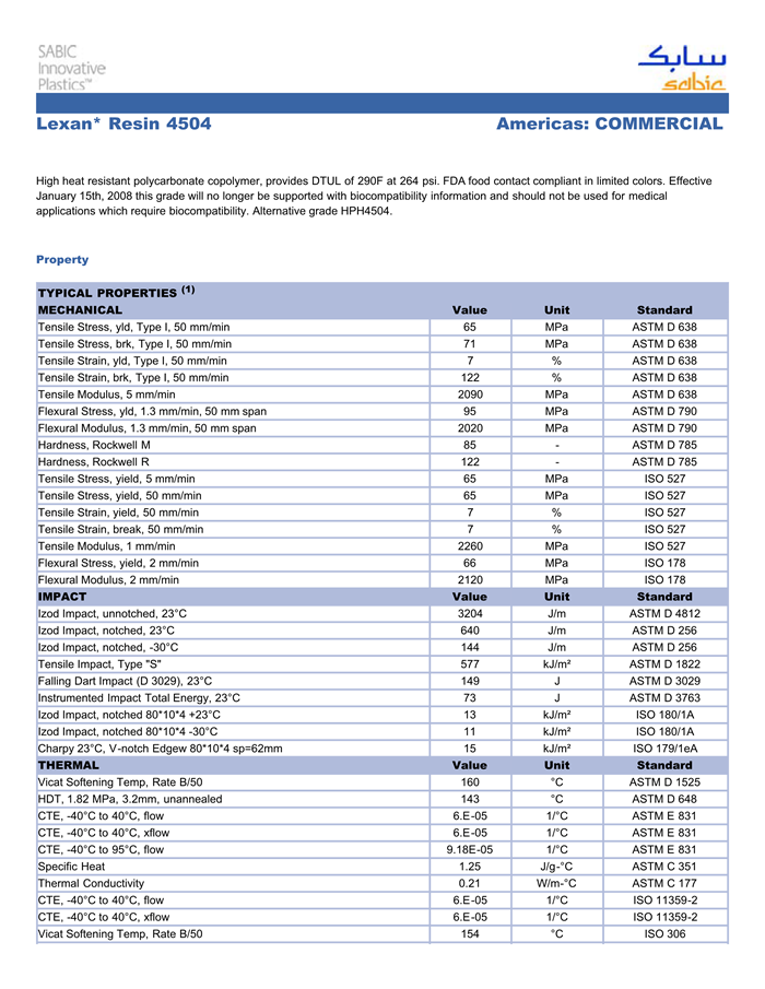 High heat resistant polycarbonate copolymer, provides DTUL of 290F at 264 psi. FDA food contact compliant in limited colors. Effective January 15th, 2008 this grade will no longer be supported with biocompatibility information and should not be used for medical applications which require biocompatibility. Alternative grade HPH4504.