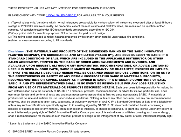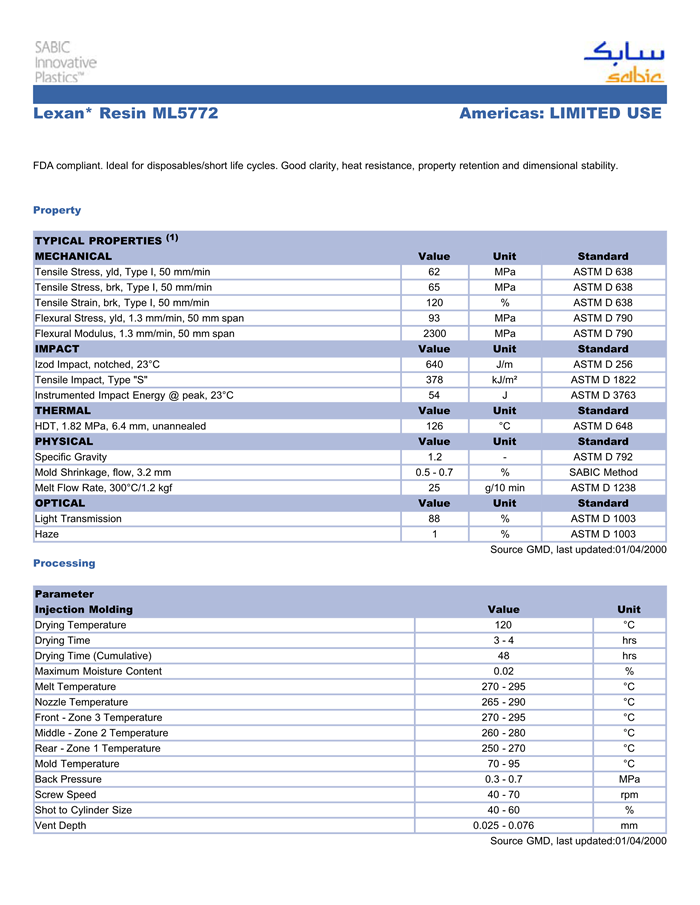 应用范围:产品描述LEXAN PC ML5772物性表FDA compliant. Ideal for disposables/short life cycles. Good clarity, heat resistance, property retention and dimensional stability.