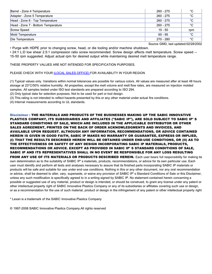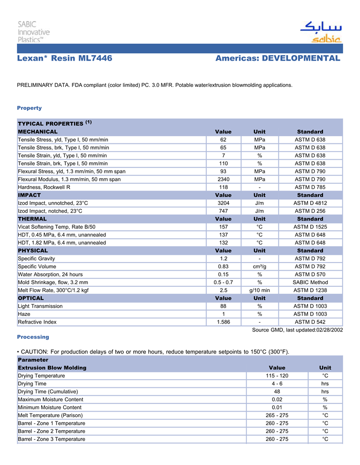 应用范围:产品描述LEXAN PC ML7446物性表PRELIMINARY DATA. FDA compliant (color limited) PC. 3.0 MFR. Potable water/extrusion blowmolding applications.