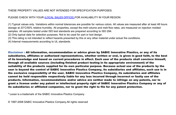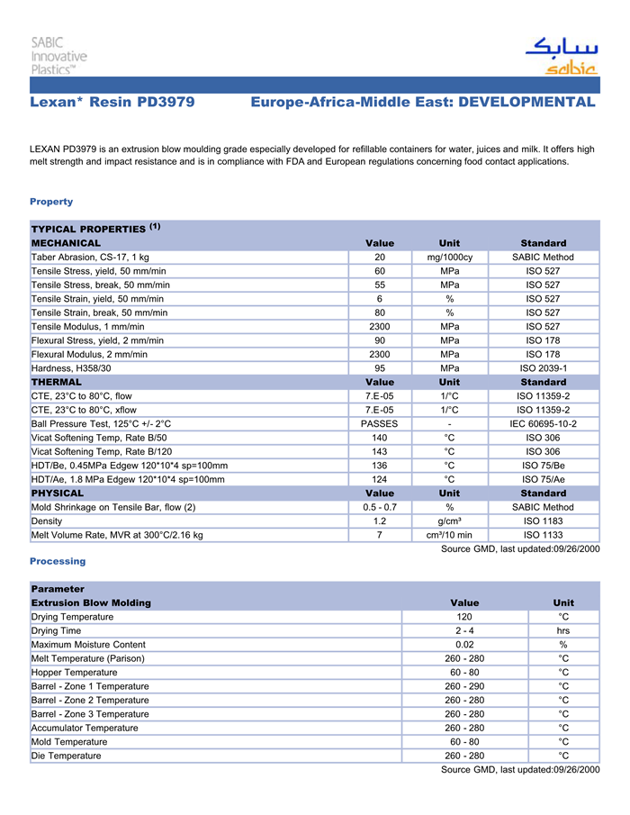 应用范围:产品描述LEXAN PC PD3979物性表LEXAN PD3979 is an extrusion blow moulding grade especially developed for refillable containers for water, juices and milk. It offers high melt strength and IMPACT resistance and