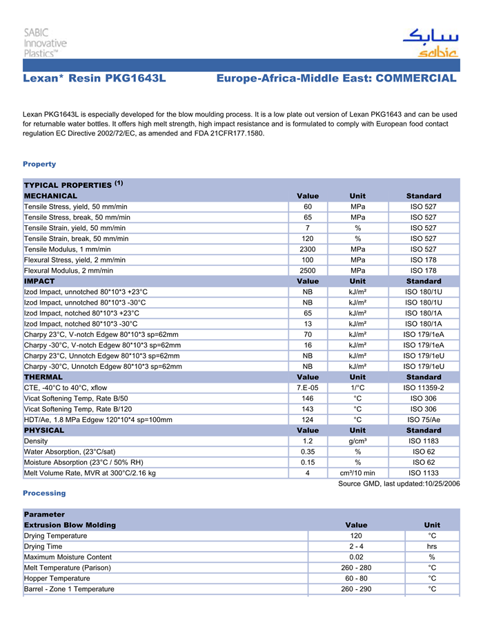 Lexan PKG1643L is especially developed for the blow moulding process. It is a low plate out version of Lexan PKG1643 and can be used for returnable water bottles. It offers high melt strength, high IMPACT resistance and is formulated to comply with European food contact regulation EC Directive 2002/72/EC, as amended and FDA 21CFR177.1580.