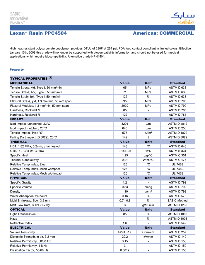 应用范围:产品描述LEXAN PC PPC4504物性表High heat resistant polycarbonate copolymer, provides DTUL of 290F at 264 psi. FDA food contact compliant in limited colors. Effective January 15th, 2008 this grade will no long
