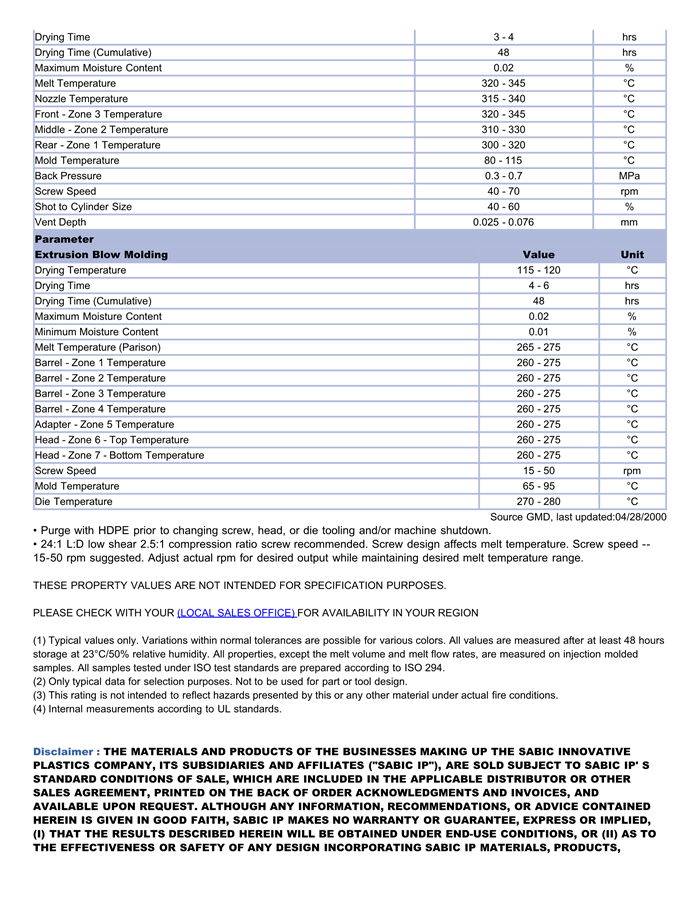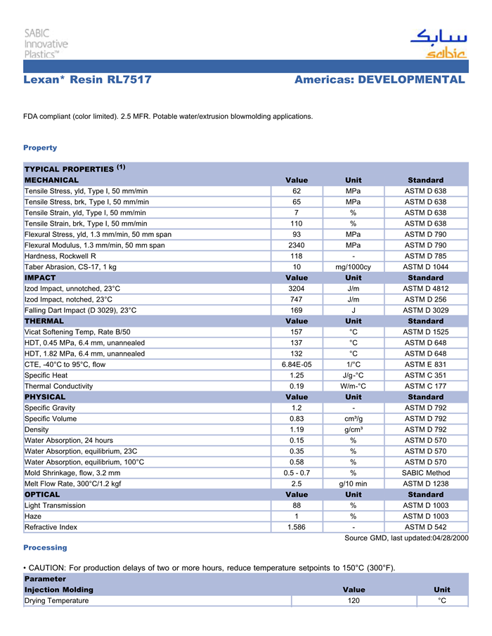 应用范围:产品描述LEXAN PC RL7517物性表FDA compliant (color limited). 2.5 MFR. Potable water/extrusion blowmolding applications.